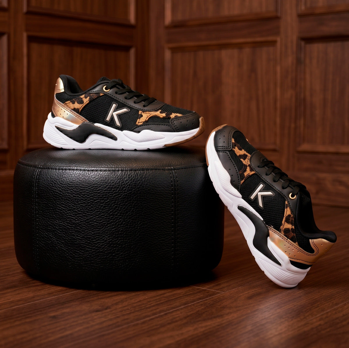 Tênis K360 Retrô Preto/Ouro com visual moderno e marcante, combinando o preto com detalhes em dourado e textura animal print que trazem estilo e personalidade ao look.