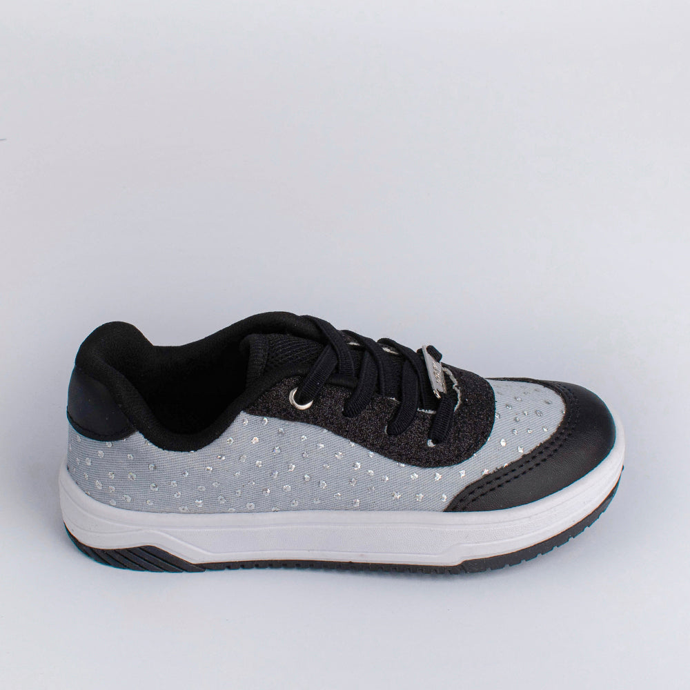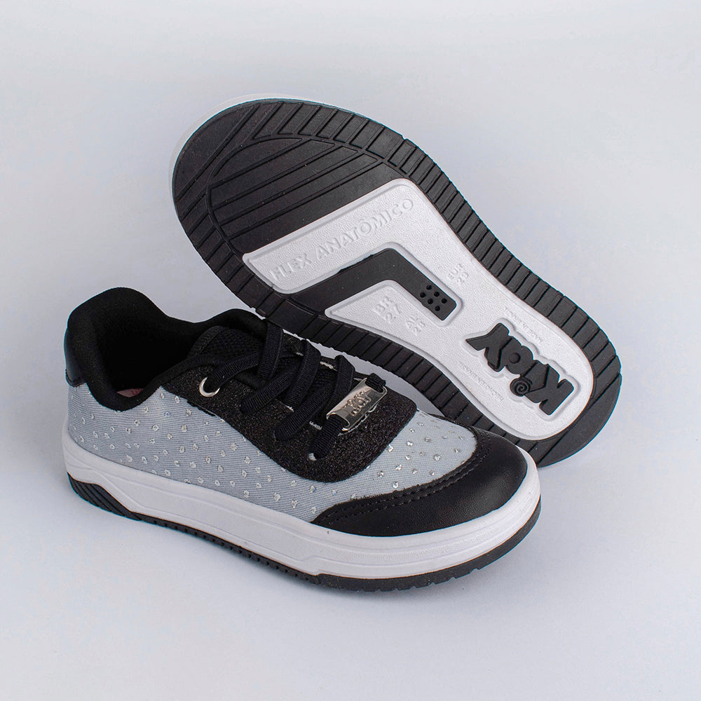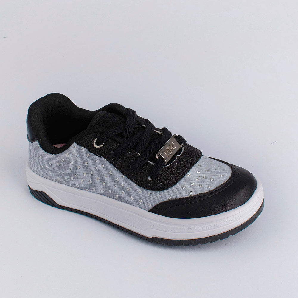 O fechamento em cadarço permite ajuste firme e personalizado, enquanto o design com toque jeans e detalhes brilhosos traz um visual moderno e cheio de personalidade.