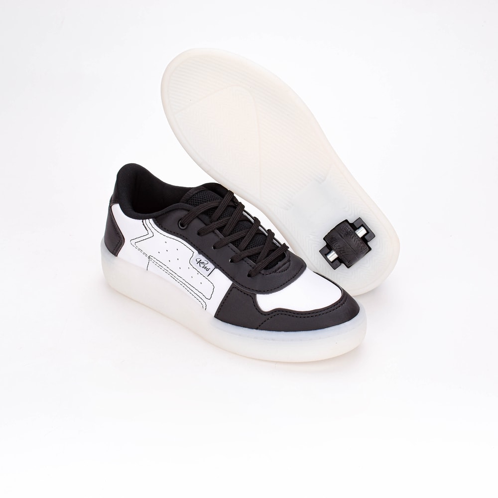 Toda espera acabou. Chegou a nova versão do famoso tênis com rodinhas e luzes led da Kidy Calçados, perfeito para diversão com muito estilo e segurança. Modelo anatômico e com fechamento em cadarço permitinho ajuste personalizado aos pés, e também pode ser utilizado com ou sem as rodinhas, pois são removíveis, ampliando as oportunidades de uso. As luzes led se acendem a cada passo, tornando o caminhar um show brilhante. Além da diversão, esse tênis de rodinha foi pensado para o conforto dos pés, produzido com materiais que combinam resistência e leveza. O tênis acompanha 02 rodinhas, 01 chave removedora e 02 tampinhas para usar o tênis sem as rodinhas.